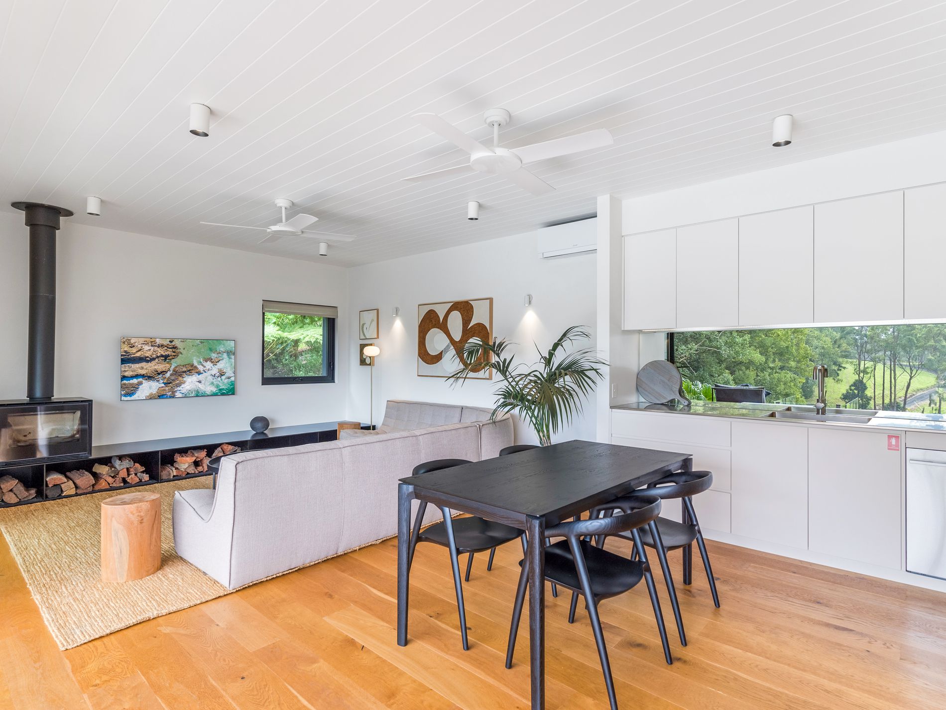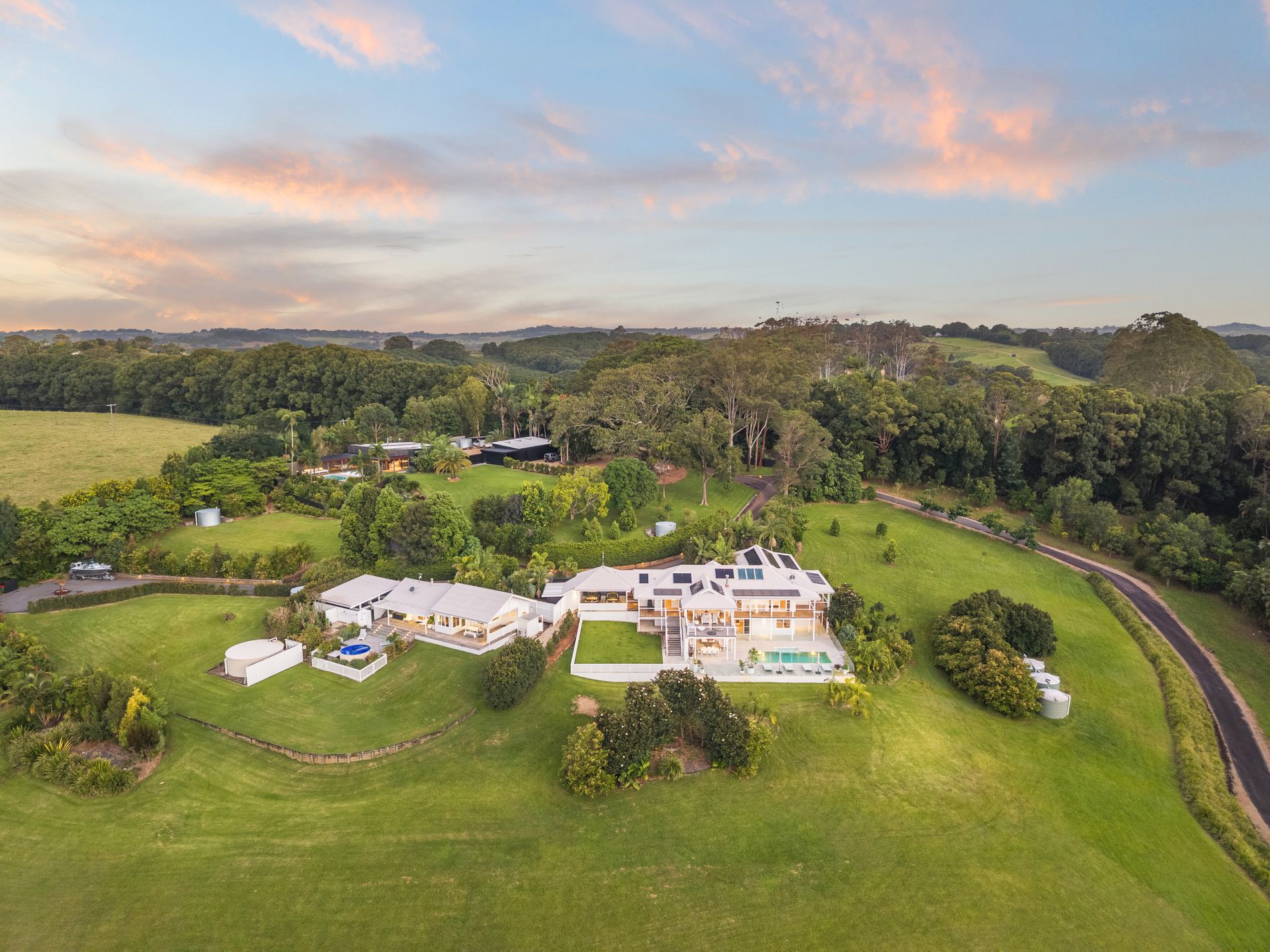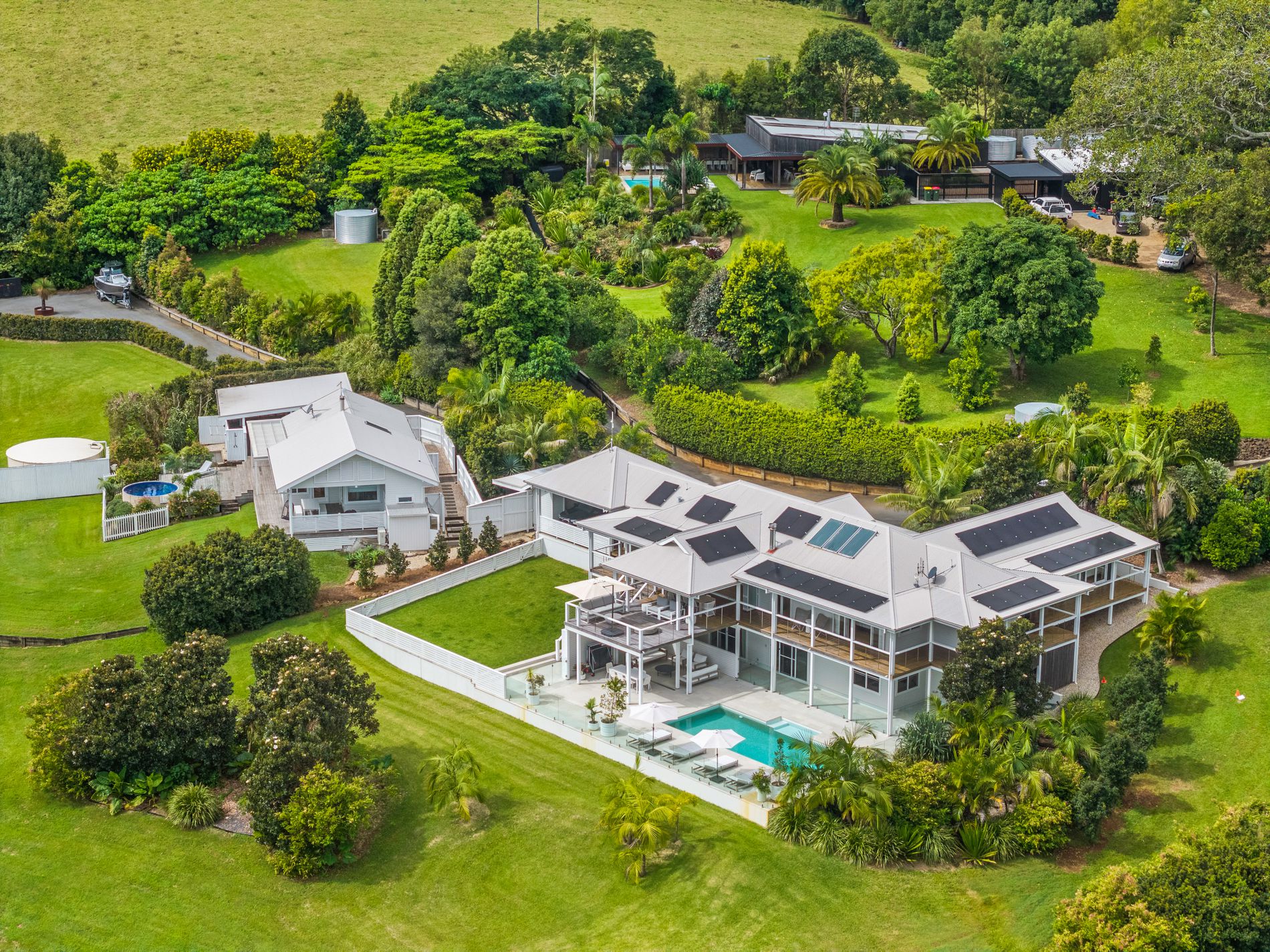 • The Farmhouse: Modern homestead with expansive views of Nightcap Range, multiple alfresco spaces, European oak flooring, and advanced Tesla power system.