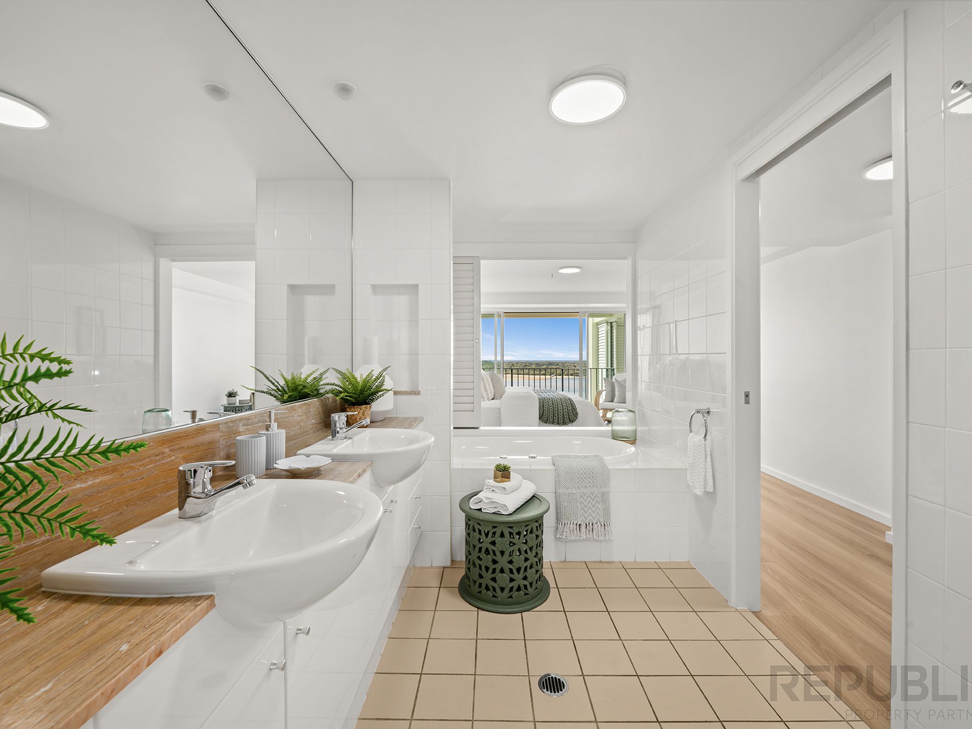 The spacious floorplan offers perfect separation between living and accommodation. The master retreat enjoys a private balcony, generous walk-in robe, and a lavish ensuite complete with a spa bath, walk-in shower and views to the water. The second bedroom is cleverly connected to the second bathroom (functioning as a second ensuite), and a third room makes the ideal home office, guest room or multipurpose space.