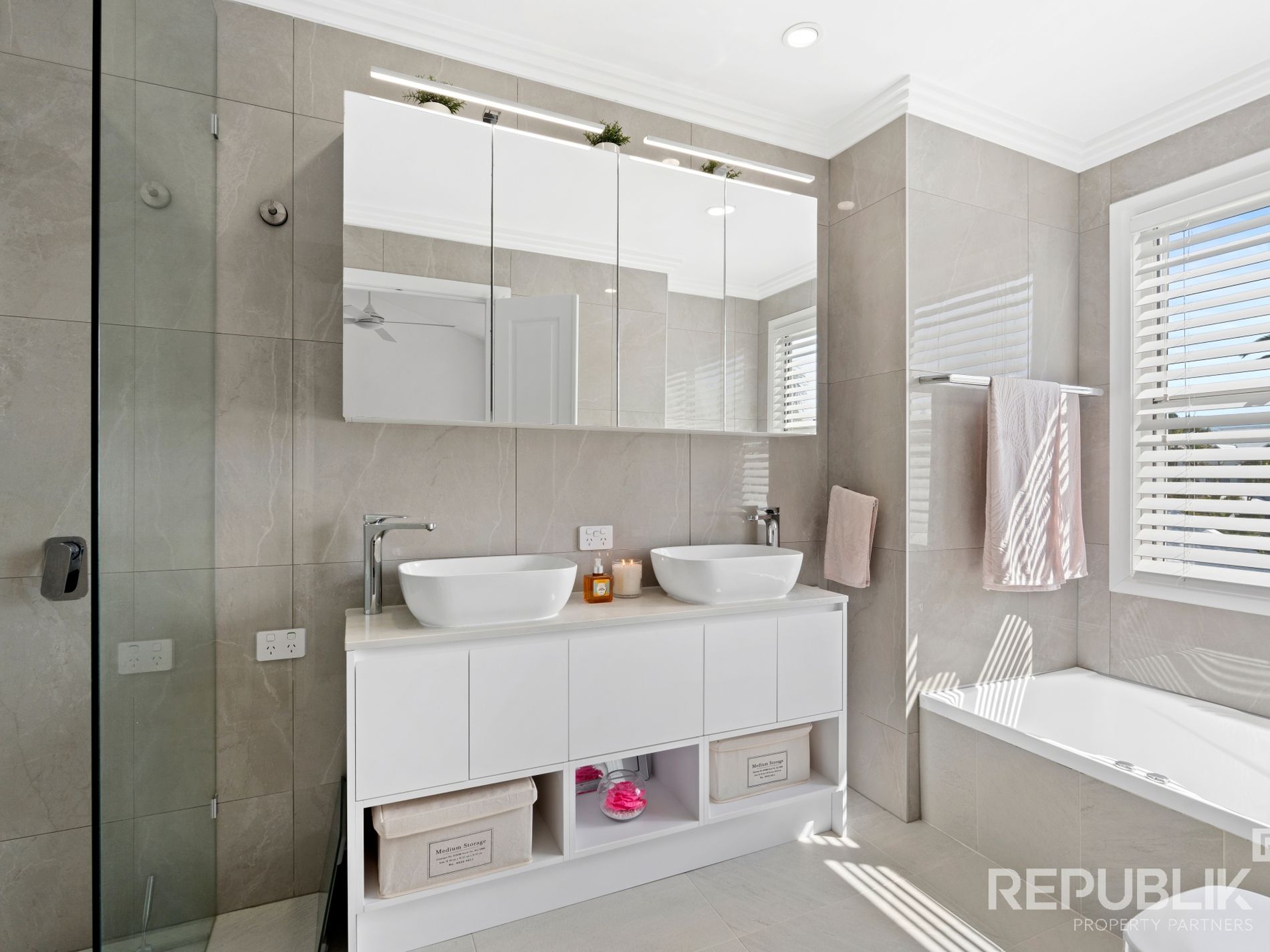 Cathedral ceilings create a warm, inviting atmosphere upstairs, where you’ll find two generous bedrooms, each with a walk-in wardrobe. The master suite is a private retreat, complete with a spacious walk-in robe, a luxurious oversized ensuite with double vanities, and a serene window seat. At the top of the stairs, a separate study or reading nook offers additional versatility.