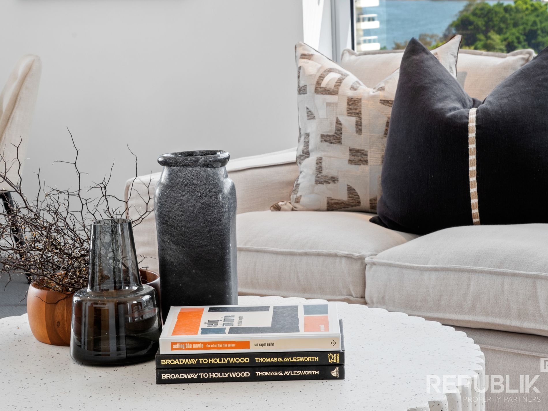 The open-plan living and dining area flows effortlessly through the highly functional walk-through floorplan to a generous balcony, an ideal place to unwind or entertain while enjoying the elevated outlook.