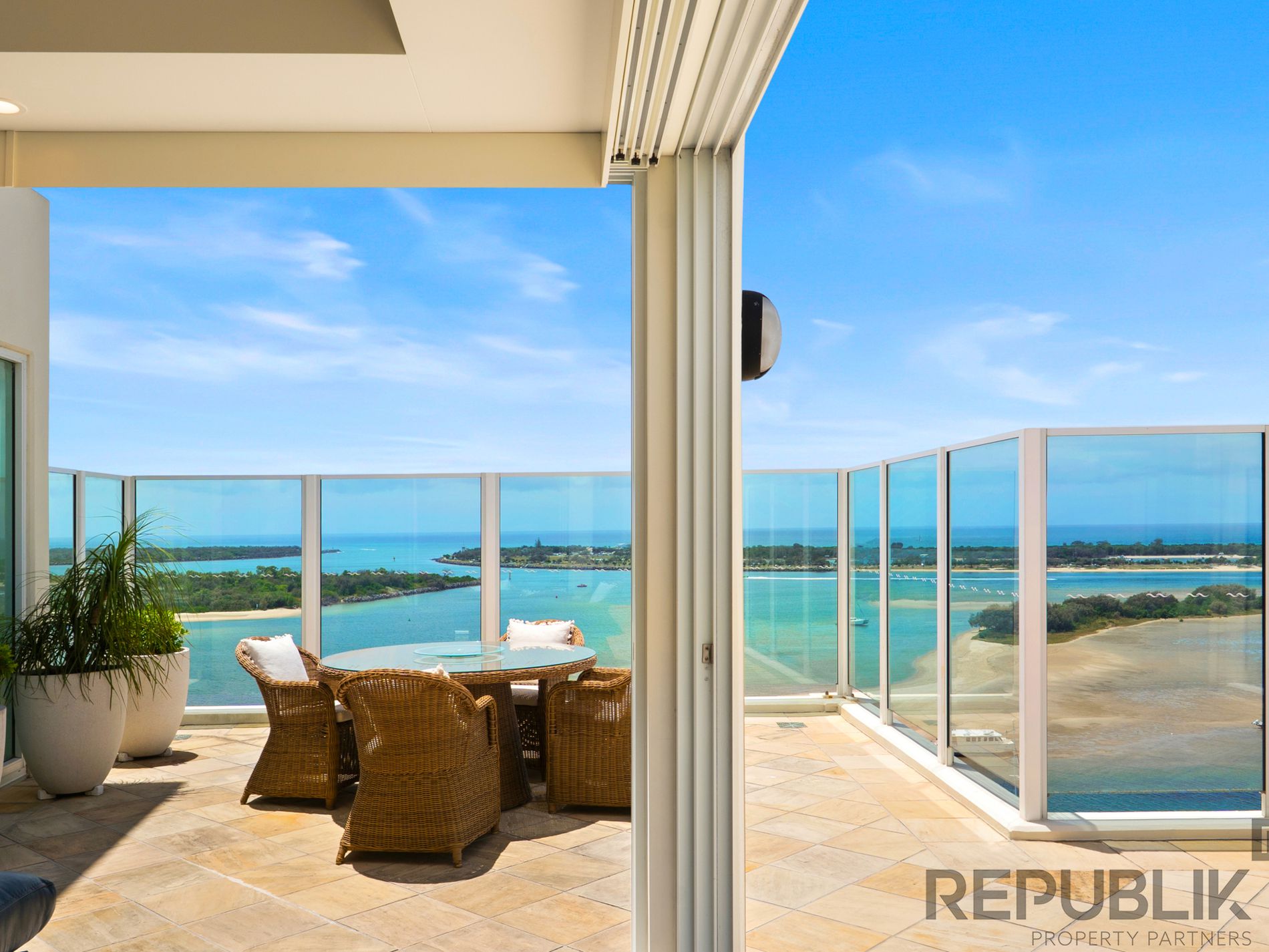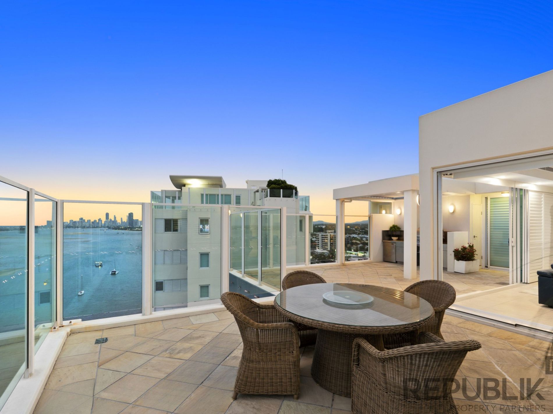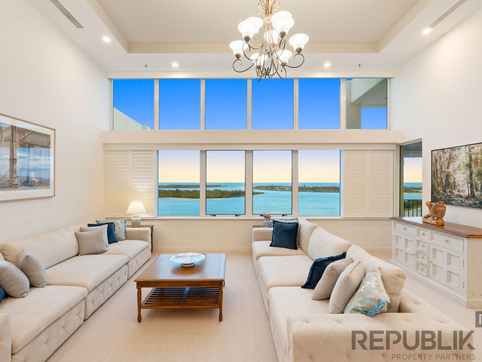 Spanning 382m², this extraordinary penthouse, with double height vaulted ceilings commands uninterrupted vistas from nearly every window across the Broadwater, extending to the city skyline, ocean entrance and hinterland beyond.