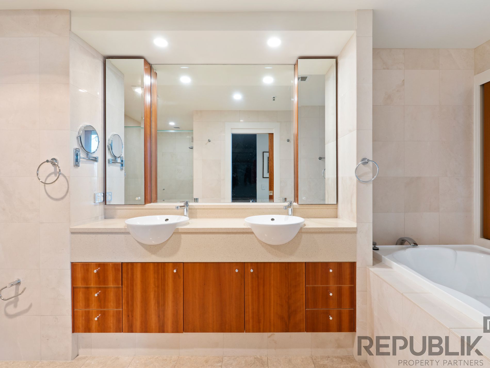 - Beautiful timber double doors between living zones