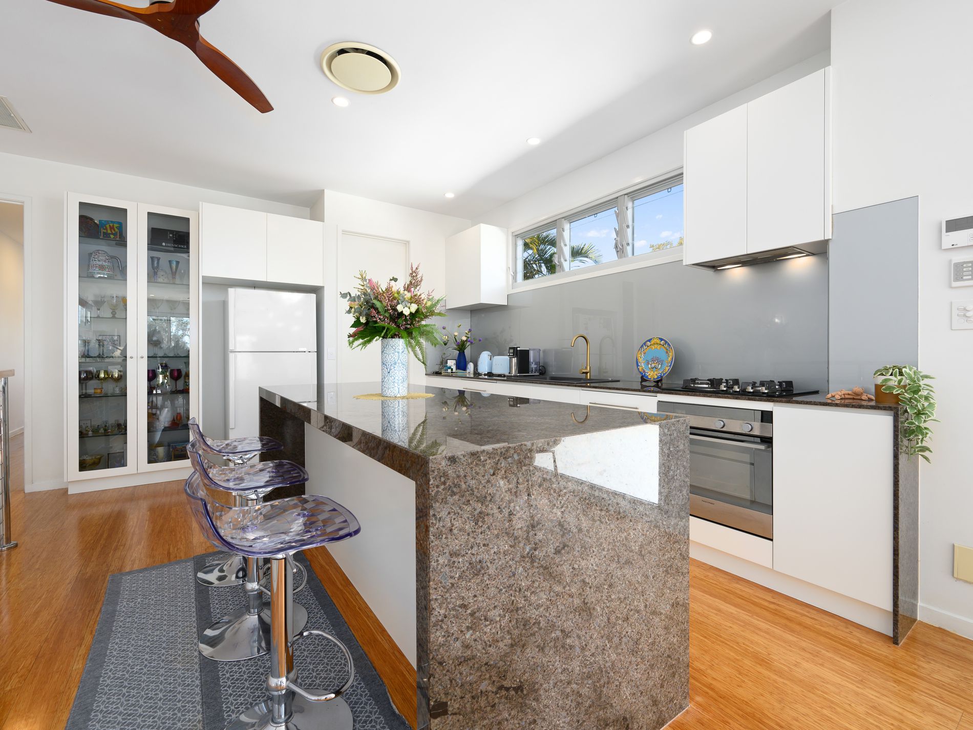 The main living and dining area connects seamlessly to the large balcony with panoramic water views, perfect for entertaining. The designer kitchen features gas cooking, large waterfall stone island, glass splashbacks and walk-in pantry.